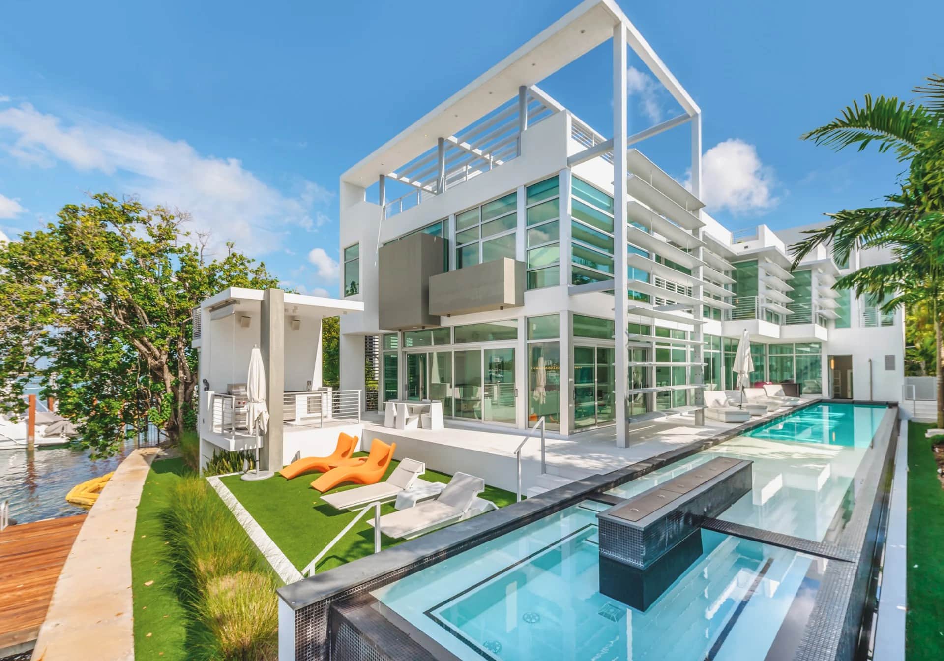 Situated at the exclusive tip of Hibiscus Island in Miami, this luxury waterfront villa rental offers the perfect escape for travelers seeking ultra-modern elegance and a prime location. Just a 10-minute drive from the lively streets and beaches of South Beach, the home provides stunning proximity to both vibrant nightlife and tranquil waterside relaxation. The standout features of this property include an elevator, a heated infinity pool, a hot tub, a private dock with boat lift, and unobstructed panoramic views over Biscayne Bay.