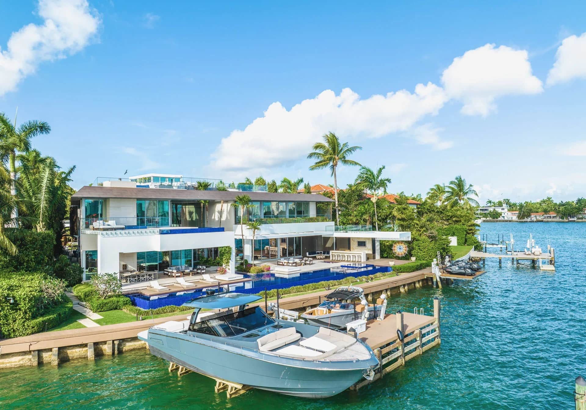 The exteriors feature lush tropical landscaping, a tranquil koi pond at the entrance, and a reflective water feature that wraps around the house. Expansive outdoor living areas include shaded lounges, sun decks with martini seating in the shallow pool, a fully equipped waterfront bar, and even a pop-up dining table at the water’s edge. Guests can also enjoy the rooftop terrace with various lounge areas and a stunning firepit—perfect for nights under the stars—with panoramic ocean and city views, plus seamless access to the sea via two private mooring docks, ideal for yachting or water sports.